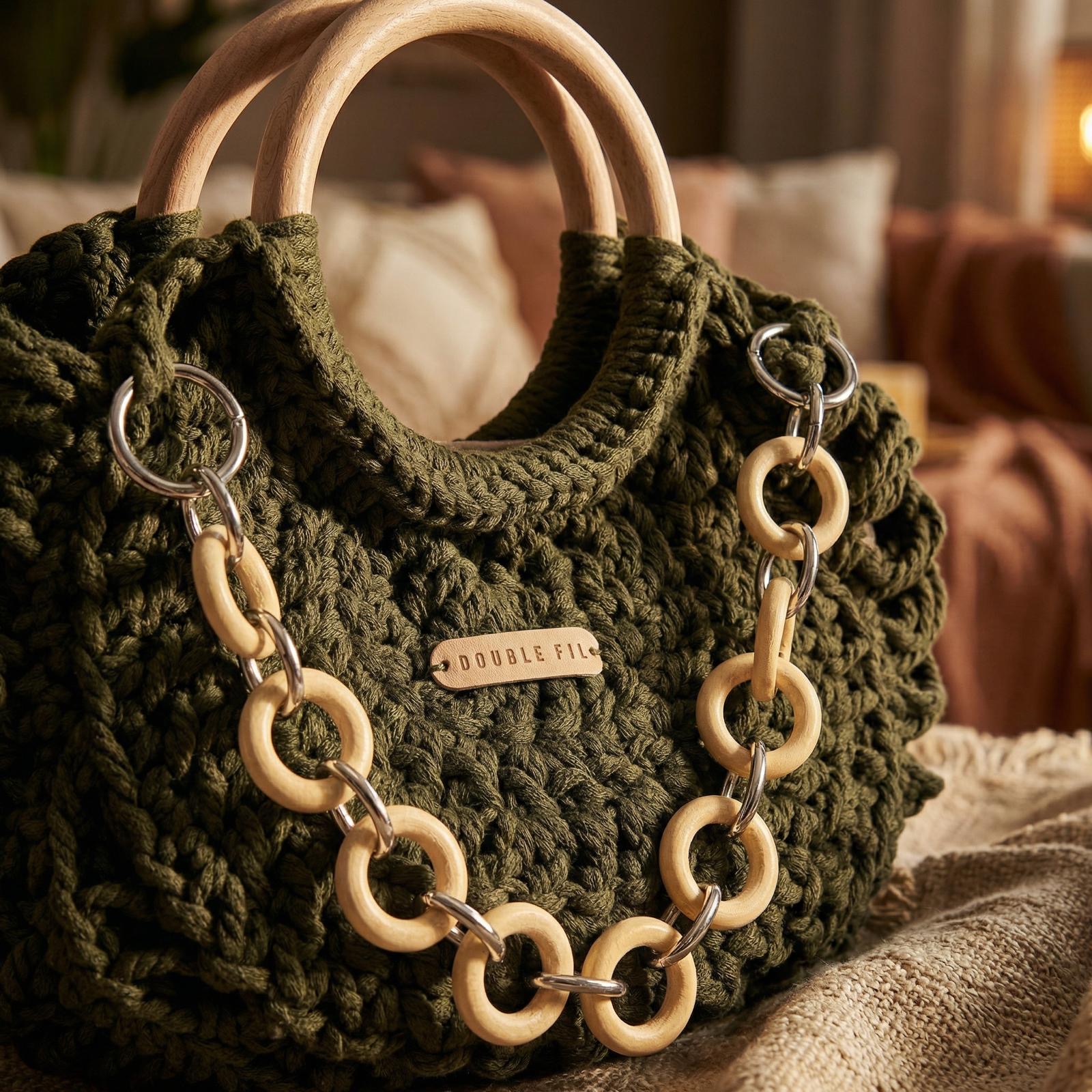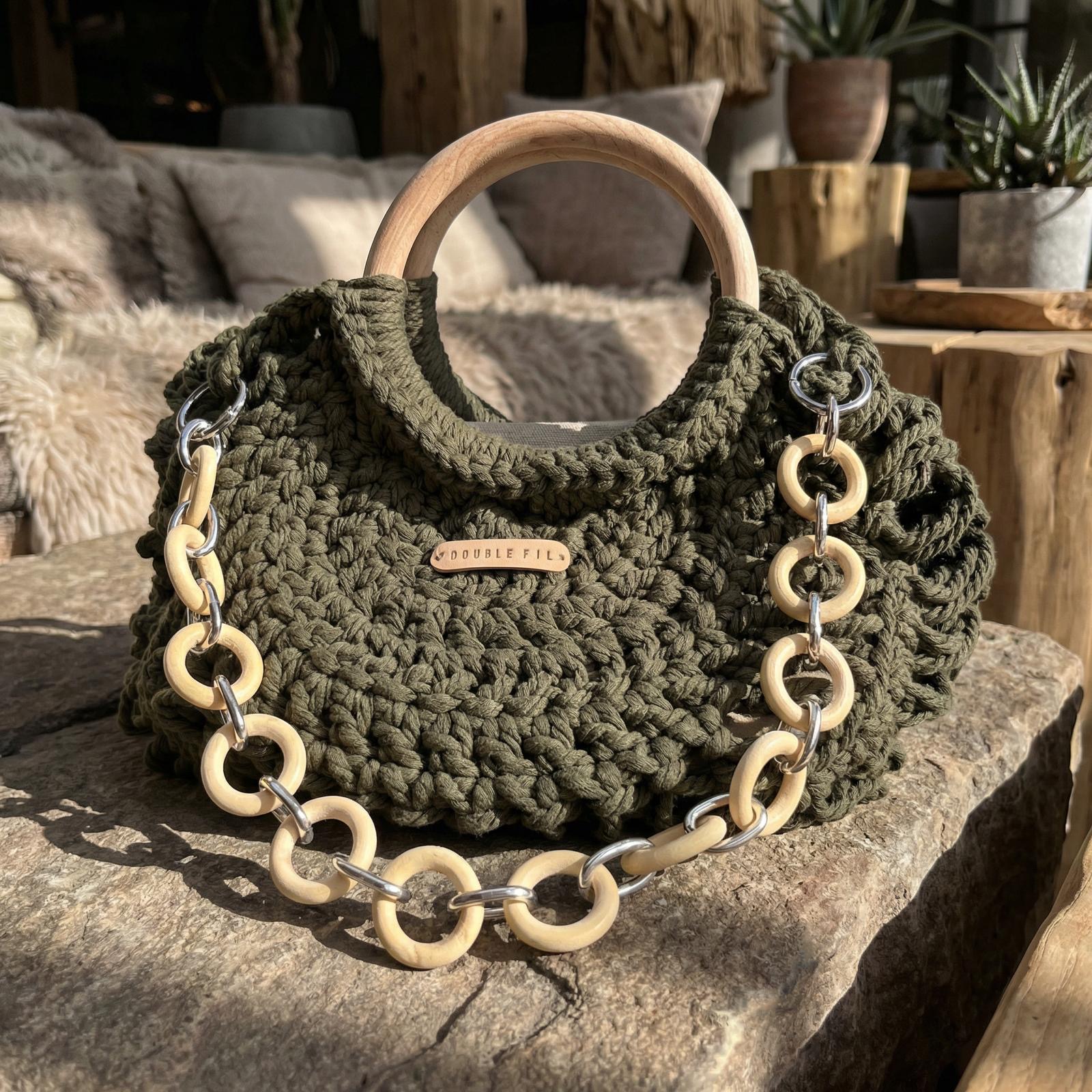 Le sac à main kaki Double Fil se targue d'une solidité à toute épreuve avec son cordage en coton et ses anses en bois et métal, sans oublier sa doublure en toile de coton et sa fermeture aimantée.